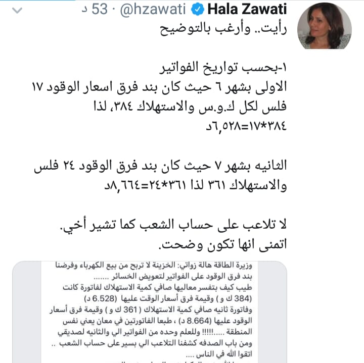 أحداث اليوم - ردت وزيرة الطاقة والثروة المعدنية هالة زواتي على اتهامات بالتلاعب في فواتير الكهرباء بين شهري حزيران وتموز ، موضحة حساب فاتورة الكهرباء الواردة في الاستفسار عبر التويتر .