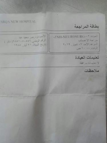 أحداث اليوم - تداول ناشطون و رواد على مواقع التواصل الاجتماعي "فيسبوك”، صورة لموعد طبي أعطي لمواطن بعد سنة لمراجعة عيادة الأعصاب في مستشفى الزرقاء الحكومي ،فقد أعطت عيادة الأعصاب في مستشفى الزرقاء الحكومي بطاقة مراجعة للمواطن " داود عمر سعيد عبد " يظهر من خلالها موعدا طبياً لمراجعتهم يوم 7 تموز 2019 .