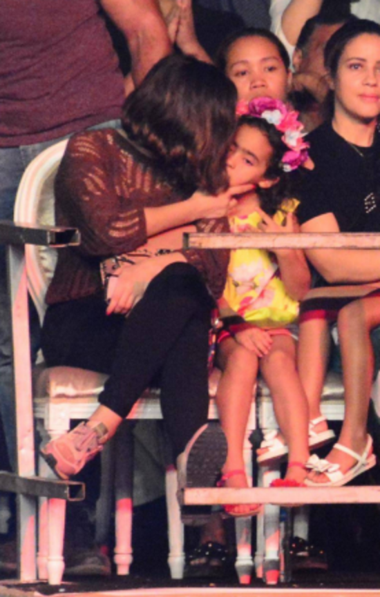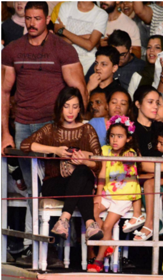 وظهر وجه تاليا ابنة تامر حسني الكبرى بوضوح في عدد من الصور، التي التقط لها وهي تجلس بجوار والدتها بسمة بوسيل وهما يستمعان للفنان المصري وهو يشعل حفله بأجمل أغانيه.