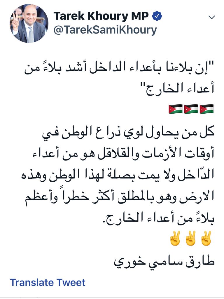 أحداث اليوم - شن النائب طارق خوري، الاثنين، هجوما على من اسماهم باعداء الأردن في الداخل، حيث هؤلاء الاعداء ، كل من يفتعل الأزمات والقلاقل ، وذلك عبر تغريدة له على حسابه الشخصي على موقع التواصل الاجتماعي "تويتر " .