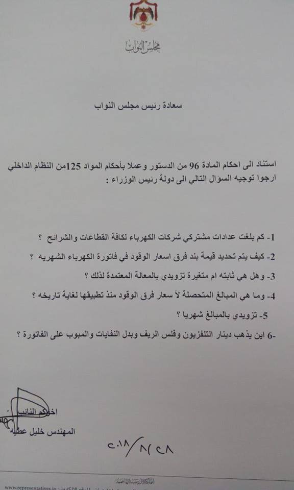 أحداث اليوم - وجه النائب خليل عطية، الإثنين، عدة تساؤلات إلى رئيس الوزراء عمر الرزاز، حول تحديد قيمة بند فرق أسعار الوقود على فاتورة الكهرباء.