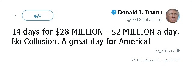 وعلّق الرئيس الأميركي على تويتر ساخرًا "14 يومًا بـ28 مليون دولار. مليونان (دولار) عن كلّ يوم"، وذلك في إشارة منه إلى الكلفة التقديرية للتحقيق الذي يجريه مولر. وأضاف ترامب "ليس هناك تواطؤ. يوم كبير لأميركا".
