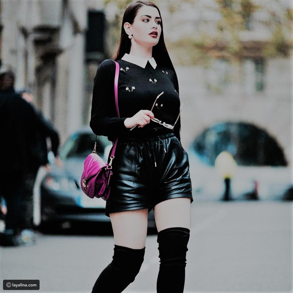 فقد ظهرت روان بن حسين وهي ترتدي كنزة خريفية سوداء تغطي قميص أبيض كلاسيكي بياقة خارجية، ونسقت إطلالتها مع هوت شورت جلدي واسع يصل لمنتصف الوركين مع حذاء من الشمواه برقبة طويلة تصل لأعلى الركبة، وأنهت إطلالتها بحقيبة جلدية باللون البنفسجي البارز.