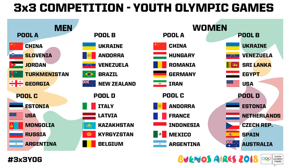 أحداث اليوم - أعلن الاتحاد الدولي لكرة السلة عن تقسيم المنتخبات المشاركة في منافسات كرة السلة 3X3 ضمن النسخة الثالثة من دورة الألعاب الأولمبية للشباب والتي تستضيفها العاصمة الأرجنتينية بوينس آيرس خلال الفترة من ٦ إلى ١٨ تشرين الأول / أكتوبر المقبل.