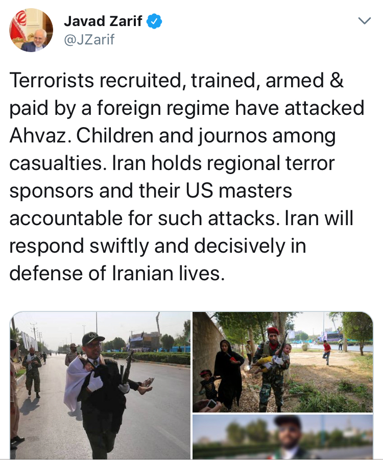 واتهم وزير الخارجية الإيراني، محمد جواد ظريف، في تعليق له على تويتر، "إرهابيين تلقوا تمويلا من نظام أجنبي"، بالوقوف وراء الهجوم، وأضاف أن "إيران تحمل رعاة الإرهاب الإقليميين وسادتهم الأمريكيين المسؤولية".