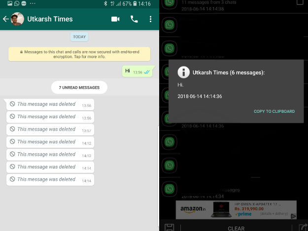 أثارت ميزة استعادة الرسائل بعد إرسالها على واتس آب خلال 7 دقائق إعجاب الكثير من المستخدمين، ومع ذلك فى بعض الأحيان عندما يقوم شخص ما بحذف رسالة واتس آب تشعر بالفضول وترغب فى قراءة الرسالة، لذا عرض موقع Gadgetsnow طريقة لقراءة الرسائل المحذوفة على هواتف أندرويد، لكن يجب أن يعمل الهاتف على نظام التشغيل Android 4.4 أو أعلى، وفيما يلى الخطوات المهمة: