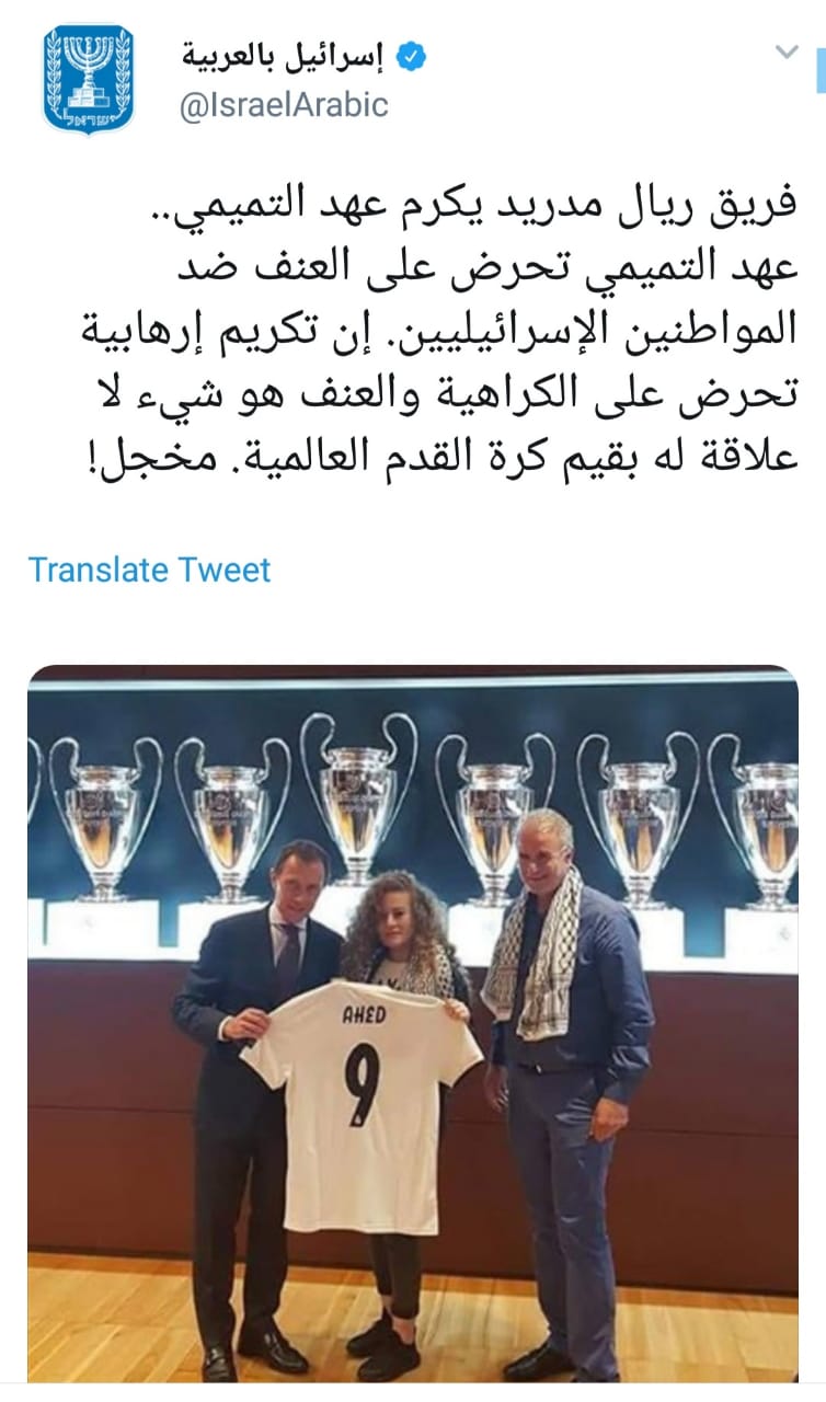 "اسرائيل" منزعجة من تكريم ريال مدريد لعهد التميمي