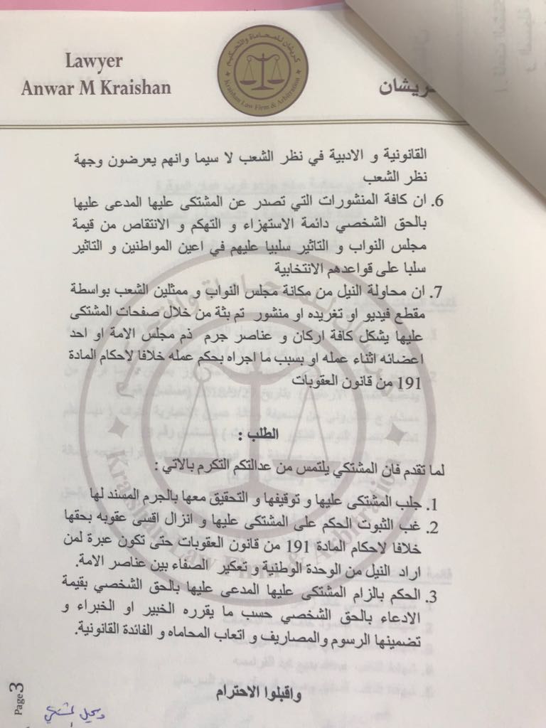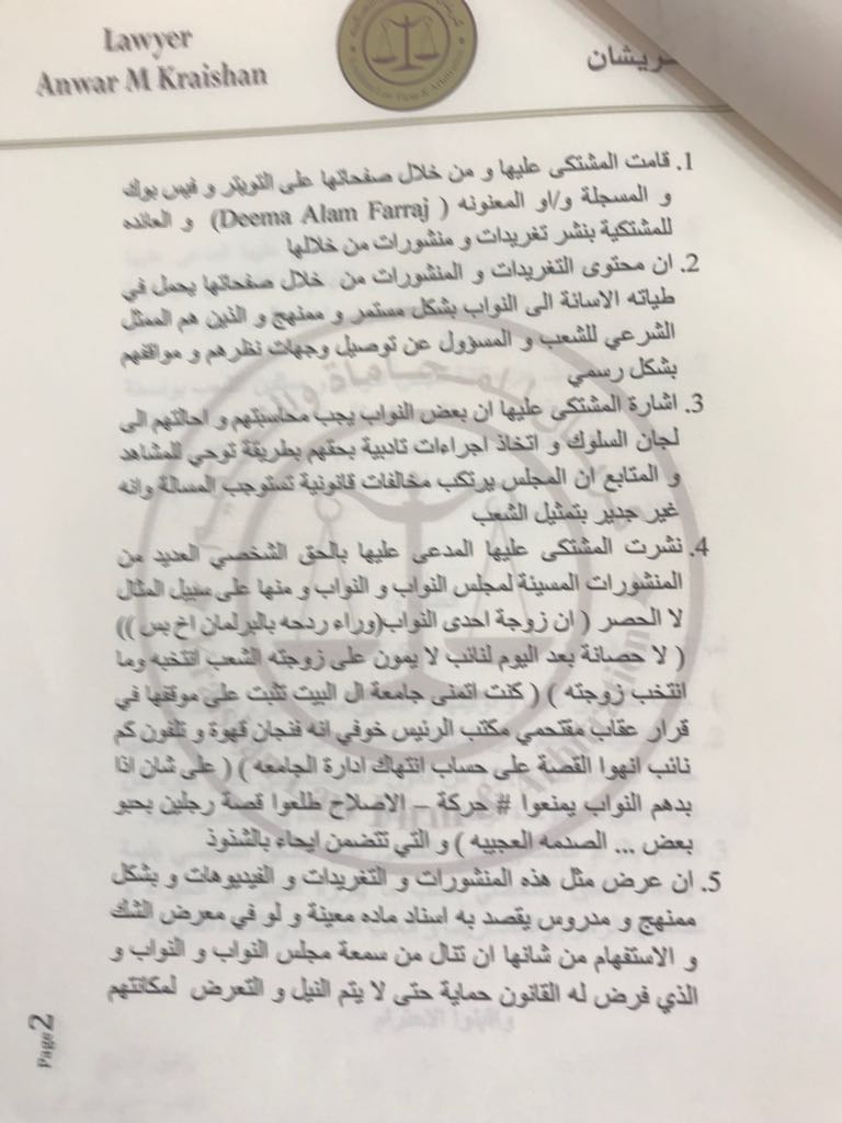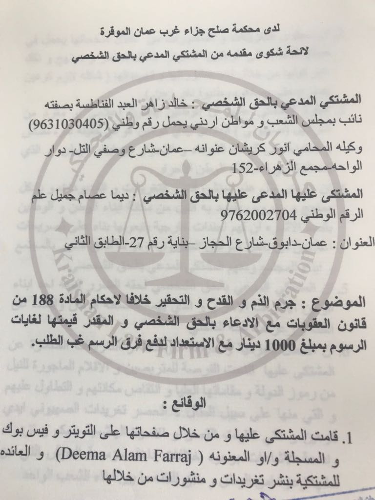 قام النائب خالد الفناطسة برفع دعوى بحق الناشطة الاجتماعية "ديمة علم فراج" ، وذلك على اثر منشورات لها عبر صفحتها على موقع التواصل الاجتماعي "تويتر" اعتبر انها تسيء للنواب.