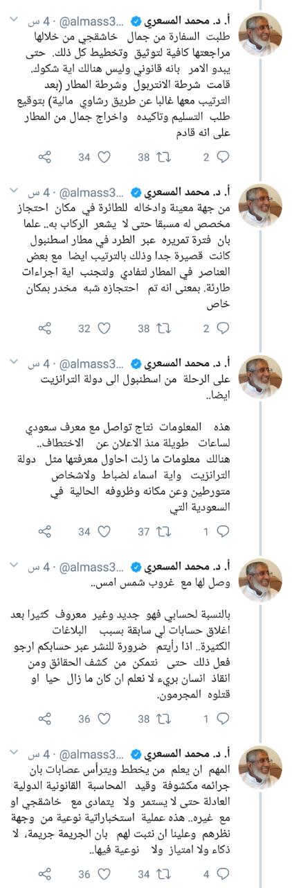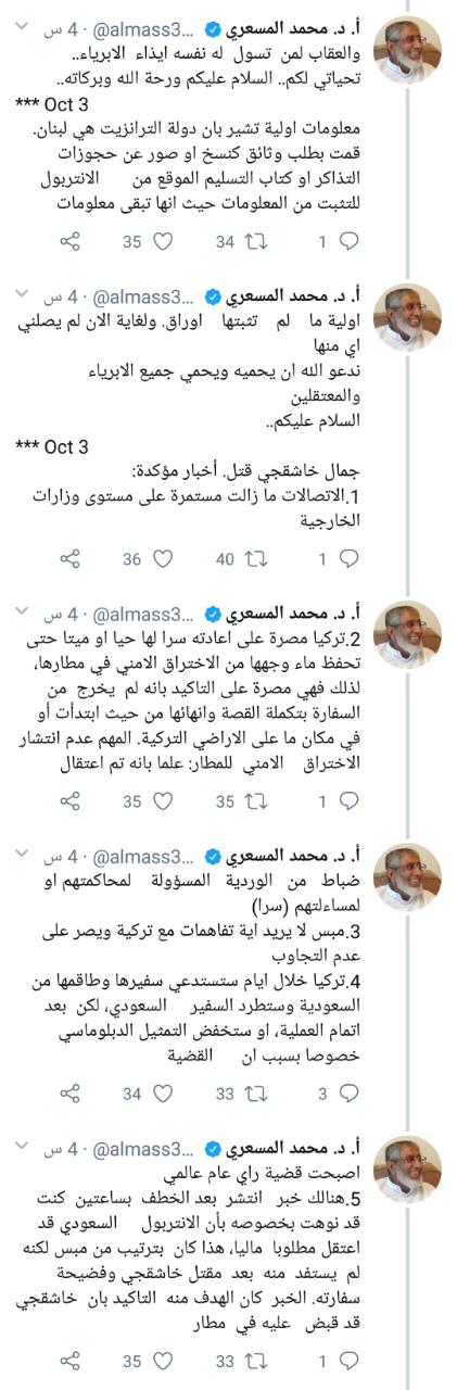 أحداث اليوم - نشر المفكر والمعارض السعودي البارز الدكتور محمد المسعري، تفاصيل ما قال إنها معلومات خطيرة جدا أمده بها أحد معارفه المطلعين بالسعودية عن حادث اختفاء الكاتب السعودي جمال خاشقجي، مؤكدا أنه تم قتله بعد نقله للمملكة داخل طرد دبلوماسي خرج عن طريق الخديعة من تركيا إلى المملكة مرورا بلبنان.