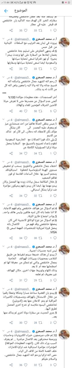 وتابع:”يلي ذلك فورا اتصالات مع الخارجية السعودية لتقوم باعداد تصريح بالتنسيق مع السفارة يحمل دولة تركيا المسؤولية الكاملة عن اختفاء جمال خاشقجي والتلويح بسحب او تخفيض مستوى الهيئة الدبلوماسية كخطوة استباقية قد يتحتم السير بها خلال الساعات القادمة او فور تفاقم التصعيد”