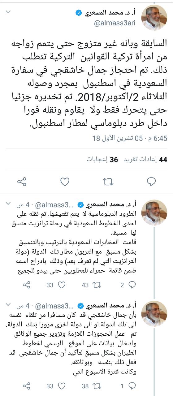 وقال “المسعري” نقلا عن مصدره في سلسلة تغريدات له عبر حسابه الرسمي بـ”تويتر" إنه تم احتجاز جمال خاشقجي في سفارة السعودية في إسطنبول بمجرد وصوله الثلاثاء 2 أكتوبر الجاري، وتم تخديره جزئيا حتى يتحرك فقط ولا يقاوم ونقله فورا داخل طرد دبلوماسي لمطار إسطنبول.