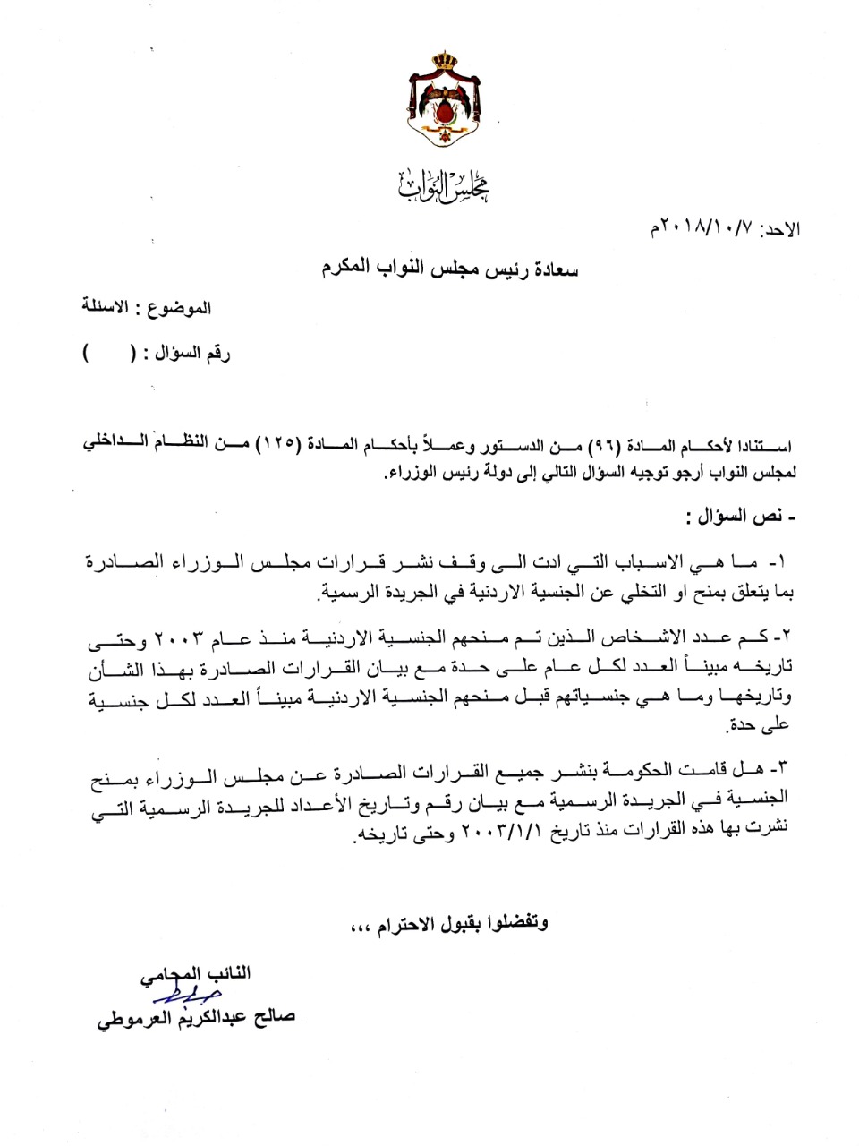أحداث اليوم - توجه النائب صالح العرموطي بسؤالٍ نيابيٍ إلى رئيس الوزراء الدكتور عمر الرزاز يتعلق بوقف نشر صفحة "الجنسية" من على الجريدة الرسمية.