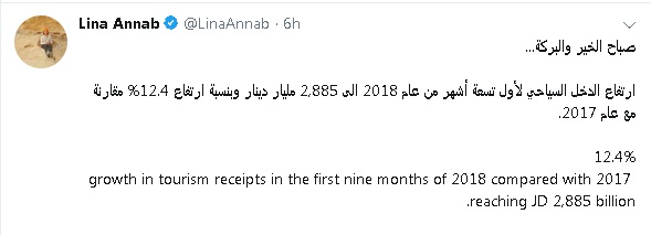 وقالت في تغريدةٍ لها عبر صفحتها على موقع التواصل الاجتماعي "تويتر" ارتفاع الدخل السياحي للمملكة لأول تسعة أشهر من عام 2018 إلى 2,885 مليار دينار.