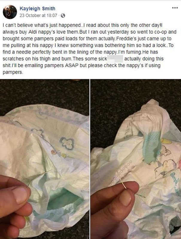وبحسب ما أفادت صحيفة "ديلي ميل" البريطانية، فقد وضعت الأمُّ وتدعى "كايلي" الحفاض لصغيرها البالغ من العمر العامَيْن، لكنّها لاحظت عدم شعورِه بالرّاحة، فقامت بخلع حفاضه لتجد إبرَة مدبَّبة تخرجُ من الحفّاض.