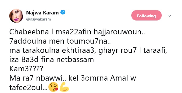 وكتبت في تغريدة عبر "تويتر" "شبابنا لمثقفين هجرونا.. حدولنا من طموحنا.. ما تركولنا اختراع غير روح الطرافة، إذا فينا نتبسم.. ما رح نبوّي، كل عمرنا أمل وتفاؤل".