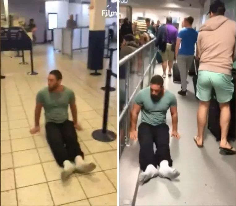 وقرر بعدها ليفين الزحف على أرض المطار باستخدام يديه، حتى وصل لمخرج المطار، مما أثار استغراب المسافرين.