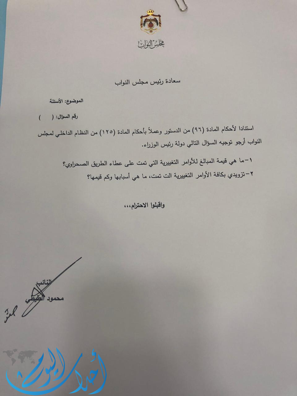 وطالب الطيطي بتزويده بقيمة المبالغ للأوامر التغييرية التي تمت على عطاء الطريق الصحراوي، إلى جانب كافة الأوامر التغييرية التي تمت وأسبابها.