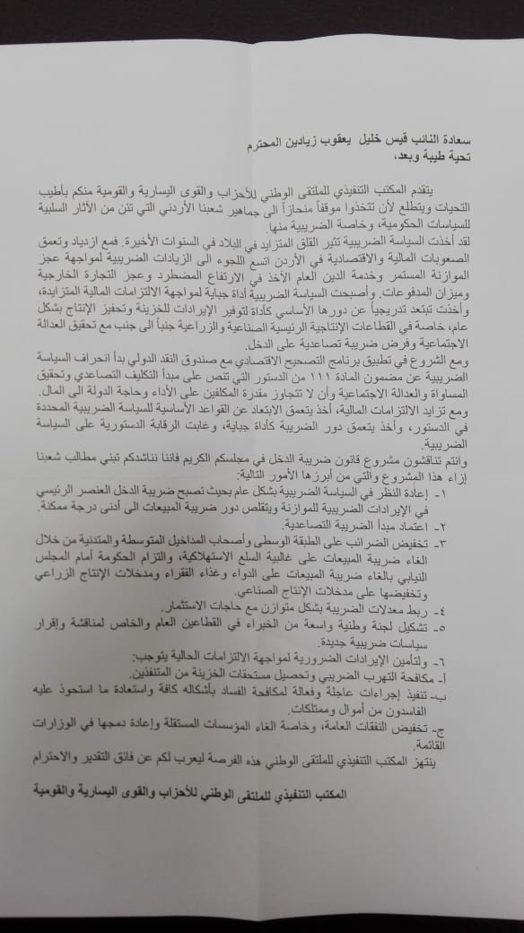 تبنى النائب قيس زيادين مطالب الاحزاب اليسارية و القومية اليوم و تلا البيان كاملا امام الحكومة و مجلس النواب و رفض تغول الحكومة على جيب المواطن و طالب بحماية الطبقتين الوسطى و الفقيرة و عمال و كادحي الوطن. كما طالب باعادة النظر بالضريبة العامة على المبيعات و تخفيضها على المواطن.