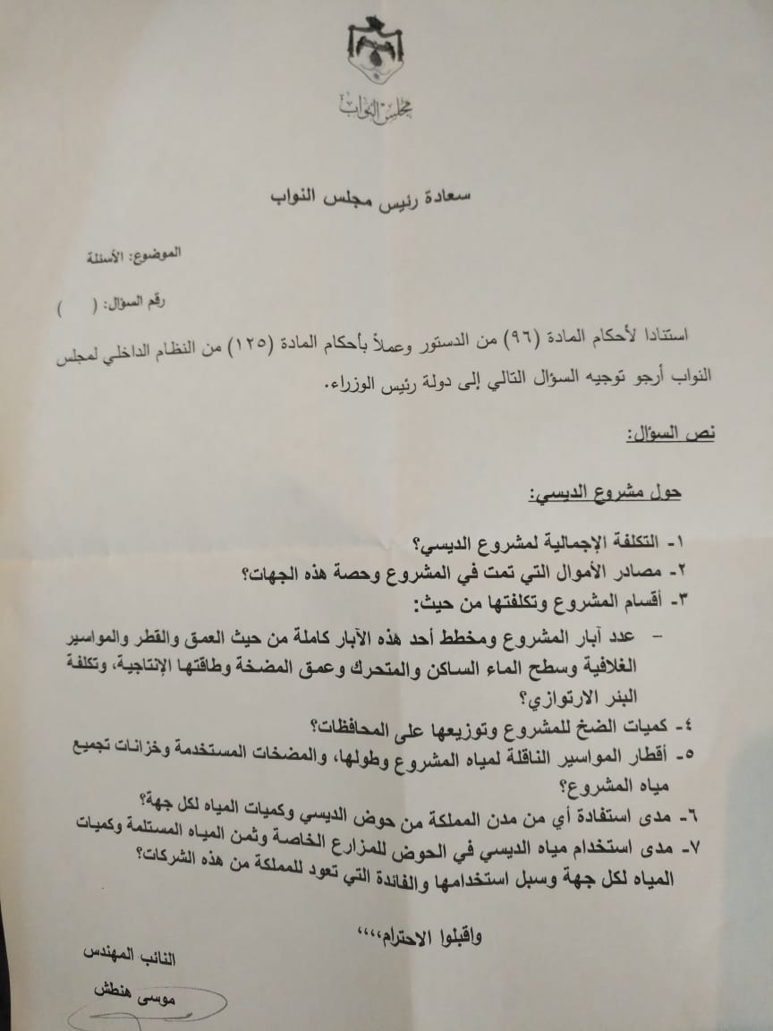 وأشار هنطش إلى أنه قد وجه أسئلةً للحكومة حول "مشروع الديسي" والتكلفة الاجمالية للمشروع ، ومصادر الأموال التي تمت في المشروع وحصة هذه الجهات.