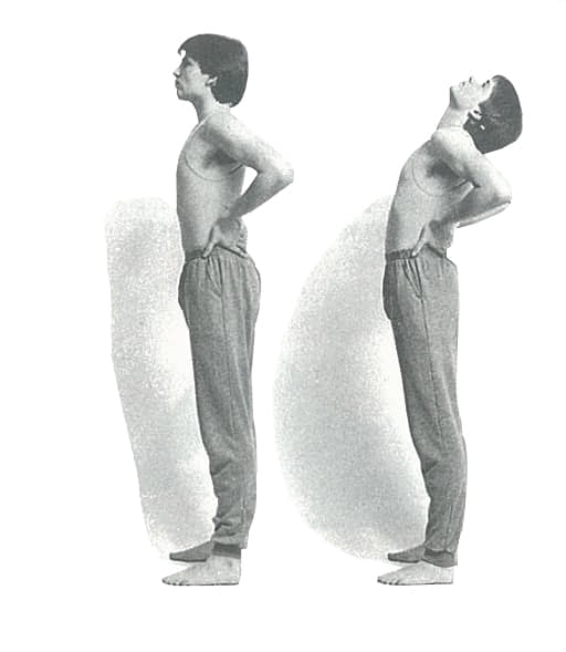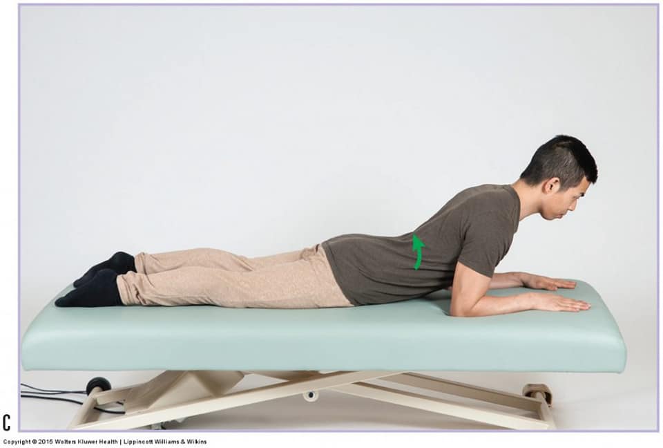 ١- وضعية الوقوف يتم ثني أعلى الجسم للخلف ودفع الورك للامام حوالي دقيقتين ثم يلاحظ أن الألم أو الخدران يتجه إلى مركز أسفل الظهر أي أنه يقل شدته وتقل مساحته. في حال تحسن المريض يقوم بالتكرار مرتين او ثلاث مرات .. في حال زاد الالم من المرة الأولى يوقف التمرين ويلغى