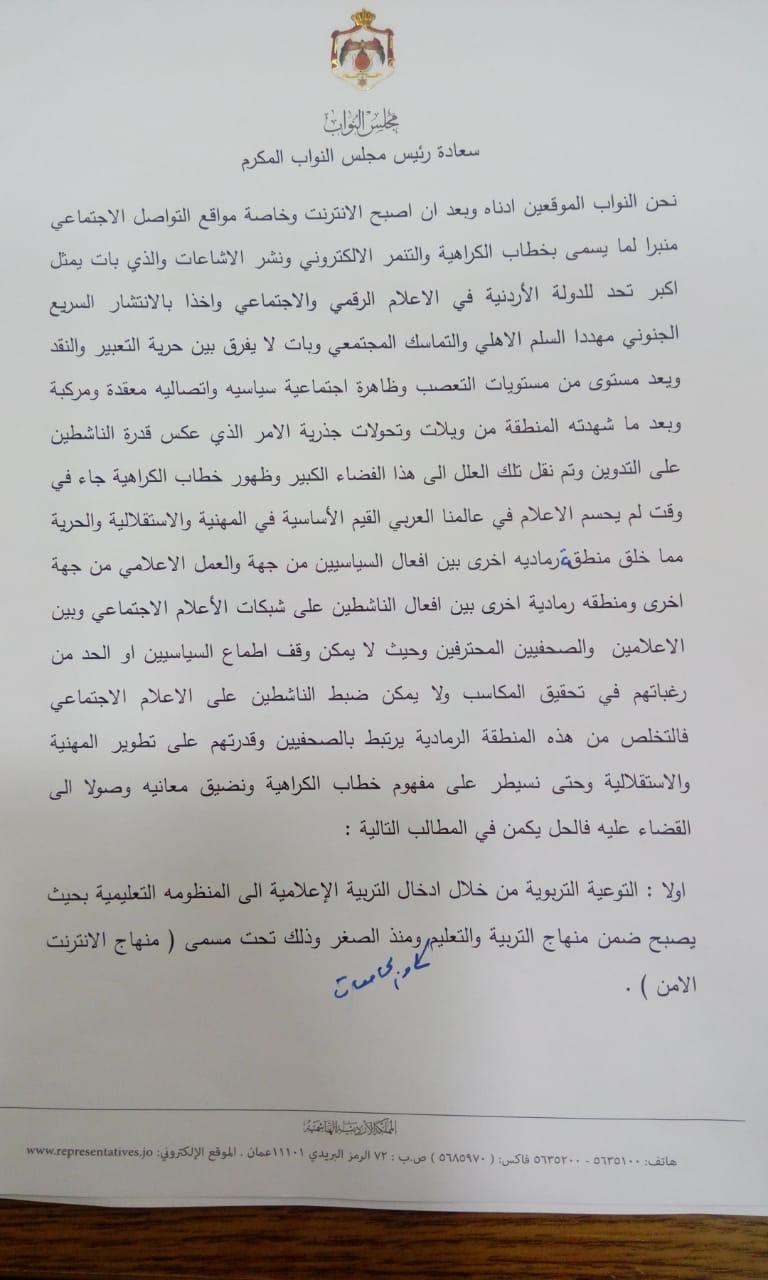 أحداث اليوم - وقع 27 نائبًا اليوم مذكرةً نيابية حول حلول لخطاب الكراهية ومحاربته لا سيما ادخال الانترنت الآمن لمناهج التعليم في المدارس والجامعات، وطالب النواب الحكومة بالعمل بمضامين المذكره وحلولها وعلى وجه السرعة.