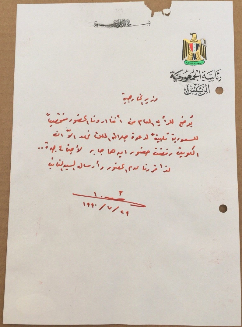 وقال: "يوضح للرأي العام من أننا أردنا الحضور شخصيا للسعودية تلبية لدعوة الملك فهد، إلا أن الكويت رفضت حضور أميرها جابر لاجتماع جدة، لذا قررنا عدم الحضور، وإرسال السيد النائب".