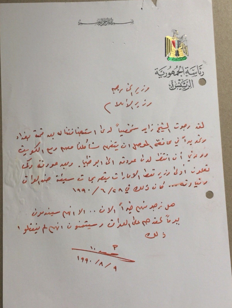 وتحدث أيضا صدام في وثائقه عن لقاء مع الشيخ زايد، وأنه دعاه إلى أن يتفهم خلافه مع دولته والكويت، وأنه لدى عودته إلى أبو ظبي، قام بتصريحات ضد قيادات عراقية، وفق قوله.