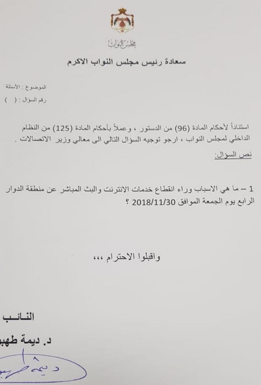 أحداث اليوم - وجهت النائب ديمة طهبوب سؤالا نيابيا للحكومة عن اسباب انقطاع خدمات الانترنت عن الدوار الرابع يوم الجمعة الماضي.وتاليا نص السؤال: