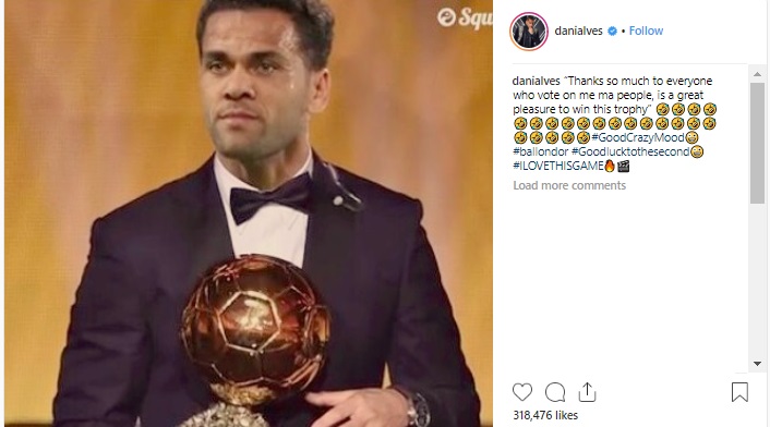 أحداث اليوم - أعلن لاعب باريس سان جيرمان داني الفيس، فوزه بالكرة الذهبية لعام 2018، وشكر ألفيس كل من صوت له من خلال تغريدة طريفة عبر صفحته على انستجرام، وبصورة مركبة يحمل من خلالها الكرة الذهبية.
