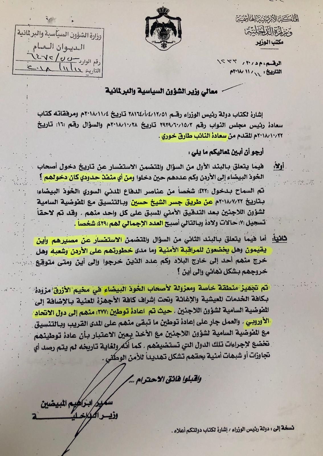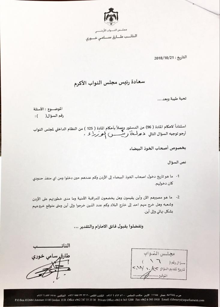 وكان خوري قد وجه أسئلة إلى رئيس الوزراء الدكتور عمر الرزاز، بخصوص أصحاب الخوذ البيضاء.
