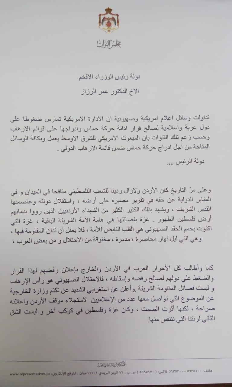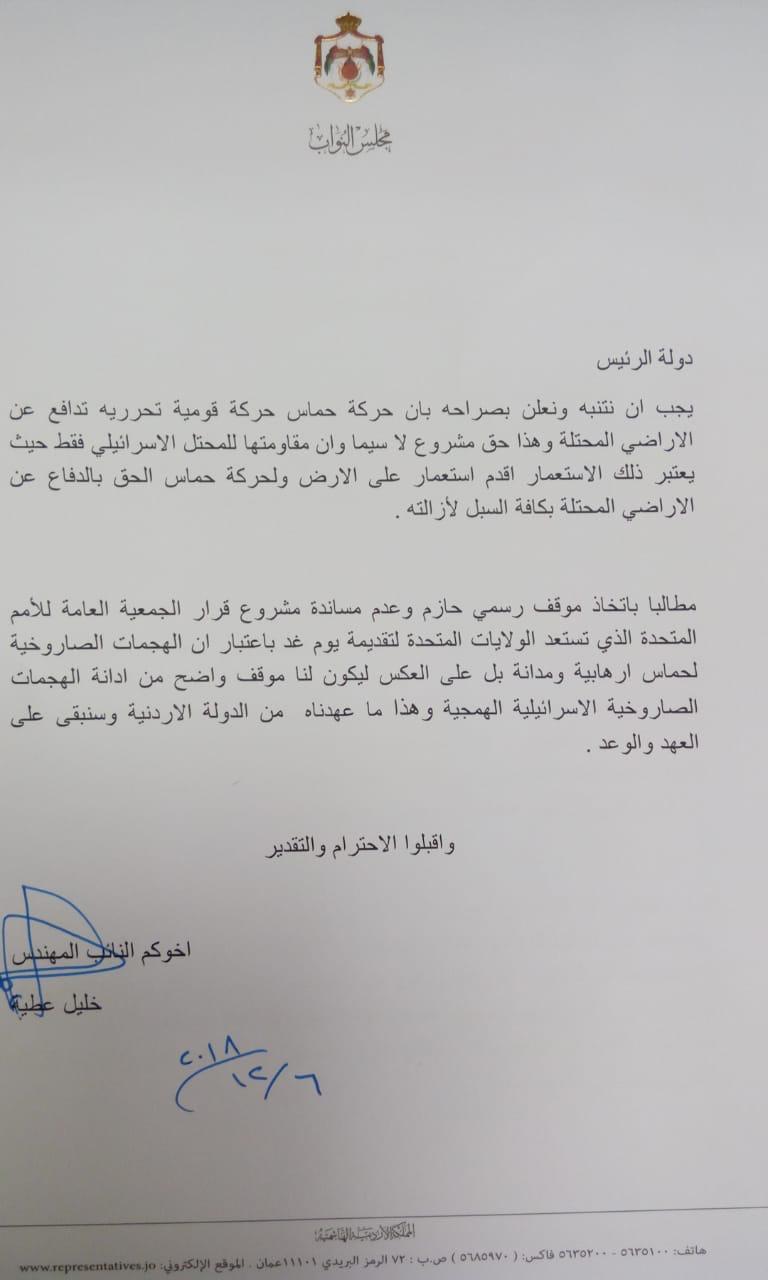 وطالب الحكومة الأردنية بمقاومة قرار المبعوث الامريكي للشرق الأوسط وعد مساندة مشروع قرار الجمعية العامة للأمم المتحدة غدًا، القاضي باعتبار الهجمات الصاروخية لحماس إرهابية ومدانة.
