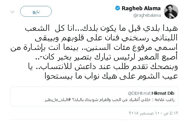 وفي جديد هذا السجال الذي اندلع على خلفية أغنية "رح يطير البلد"، غرّد ديب عبر صفحته الخاصة "تويتر": "راغب علامة : خللي أغانيك عن الحب والغرام شو بدك بالبلد؟".