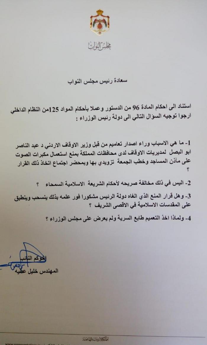 أحداث اليوم - وجه النائب خليل عطية استجواباً نيابياً لوزير الأوقاف عبد الناصر أبو البصل يسأله عن أسباب اتخاذه القرار ويطالب بالحصول على محضر الإجتماع الذي تم من خلاله اتخاذ هذا القرار الذي قام بإلغائه رئيس الوزراء الدكتور عمر الرزاز.
