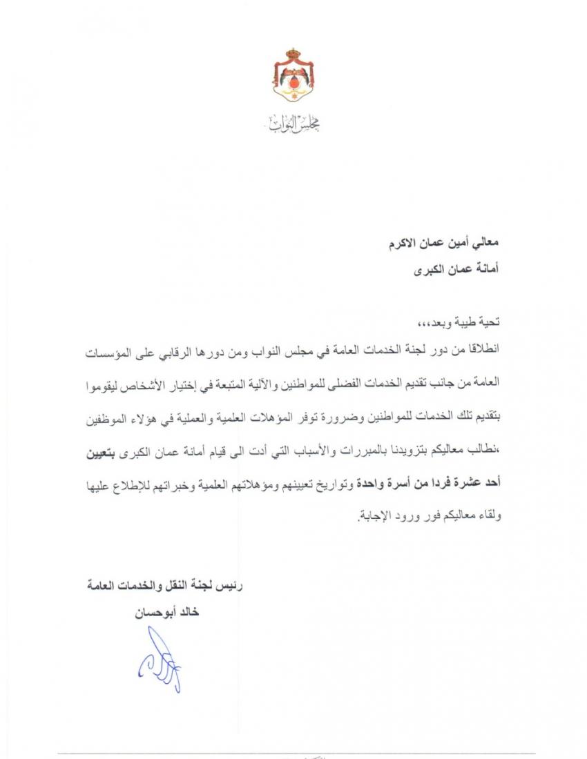 أحداث اليوم - وجه النائب خالد أبو حسان سؤالاً نيابياً إلى أمانة عمان الكبرى يستفسر فيه عن الأسباب التي أدت إلى تعيين 11 فرداً من نفس العائلة في أمانة عمان الكبرى.