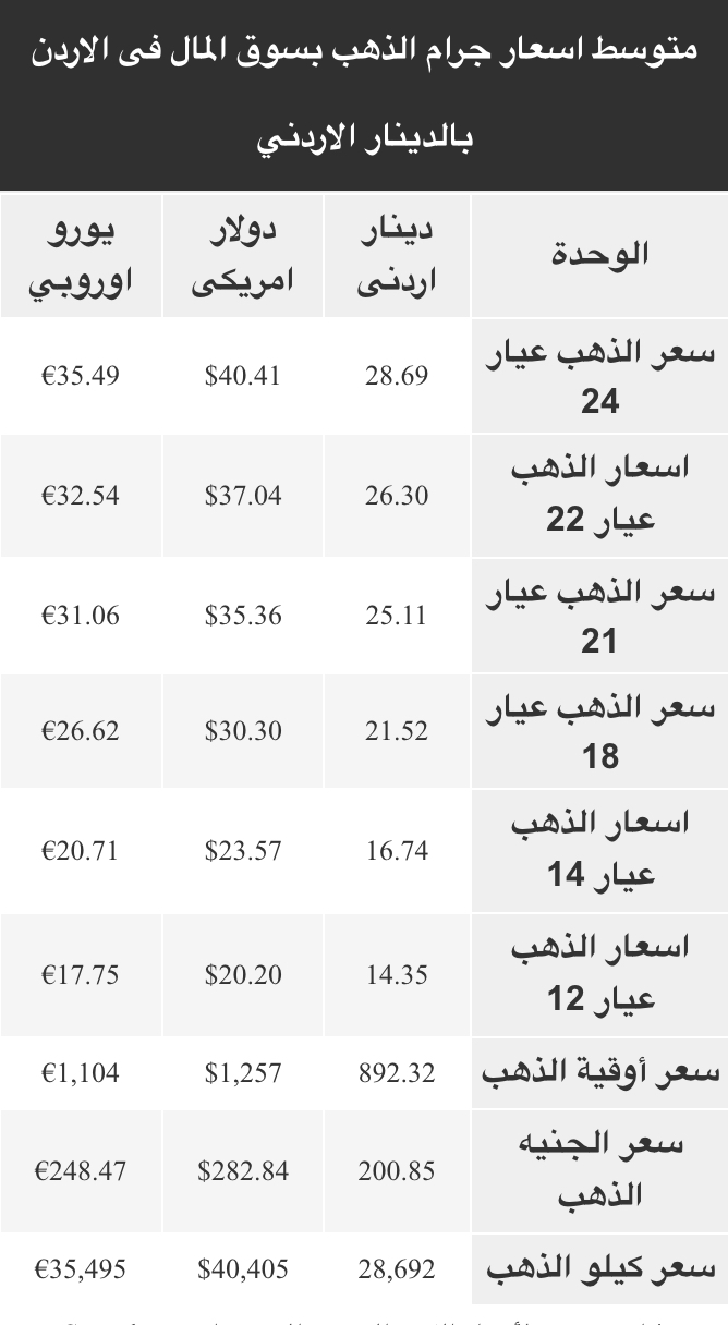 ويتضمن سعر الذهب عيار 24، 22، 21، 18، 14، 12، ويشمل أيضاً سعر كيلو الذهب وسعر الأوقية - الأونصة - وجنيه الذهب طبقا للأسعار في الأسواق الأردنية.