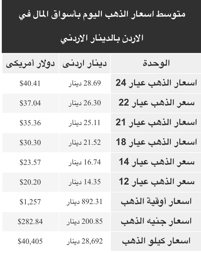 ويتضمن سعر الذهب عيار 24، 22، 21، 18، 14، 12، ويشمل أيضاً سعر كيلو الذهب وسعر الأوقية - الأونصة - وجنيه الذهب طبقا للأسعار في الأسواق الأردنية.