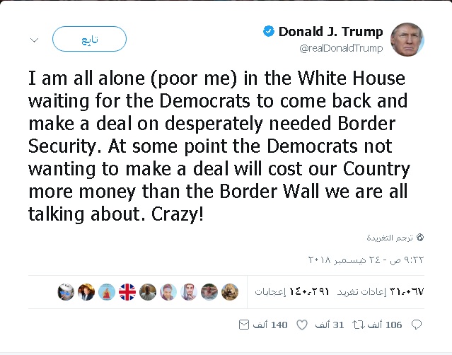 وكتب ترامب في تغريدة على تويتر ''أنا وحيد، ومسكين في البيت الأبيض، أنتظر عودة الديمقراطيين، للتوصل إلى اتفاق بشأن تأمين الحدود''.