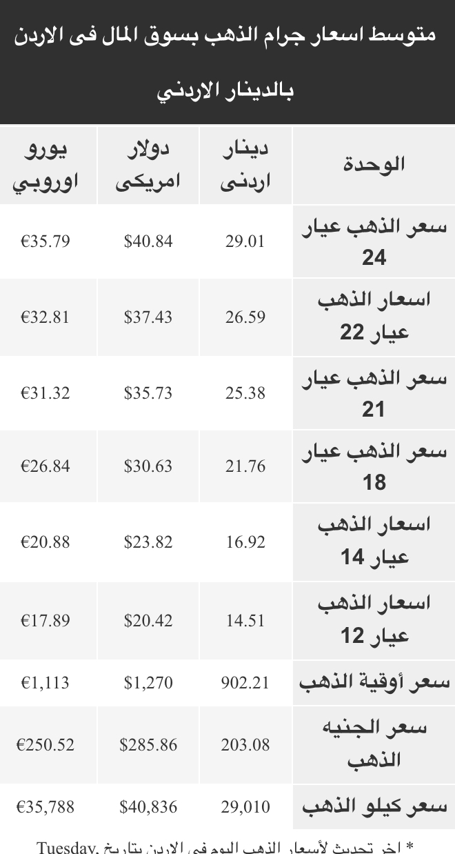 ويتضمن سعر الذهب عيار 24، 22، 21، 18، 14، 12، ويشمل أيضاً سعر كيلو الذهب وسعر الأوقية - الأونصة - وجنيه الذهب طبقا للأسعار في الأسواق الأردنية.
