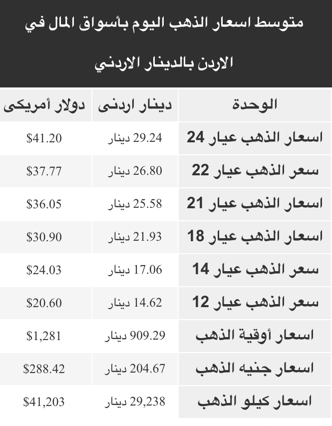ويتضمن سعر الذهب عيار 24، 22، 21، 18، 14، 12، ويشمل أيضاً سعر كيلو الذهب وسعر الأوقية - الأونصة - وجنيه الذهب طبقا للأسعار في الأسواق الأردنية.