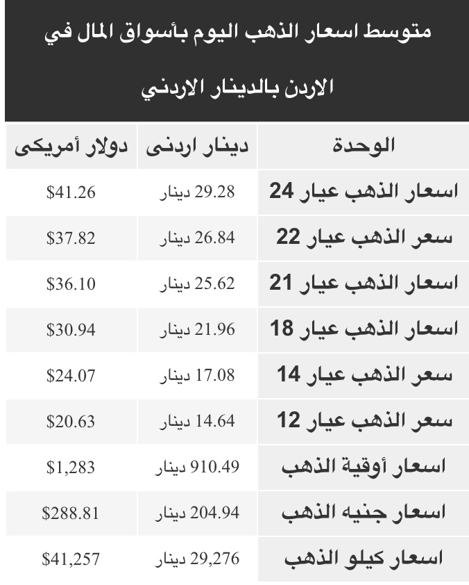 ويتضمن سعر الذهب عيار 24، 22، 21، 18، 14، 12، ويشمل أيضاً سعر كيلو الذهب وسعر الأوقية - الأونصة - وجنيه الذهب طبقا للأسعار في الأسواق الأردنية.