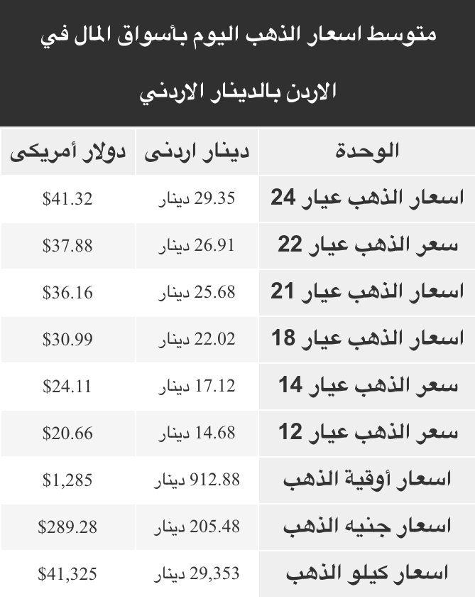 ويتضمن سعر الذهب عيار 24، 22، 21، 18، 14، 12، ويشمل أيضاً سعر كيلو الذهب وسعر الأوقية - الأونصة - وجنيه الذهب طبقا للأسعار في الأسواق الأردنية.