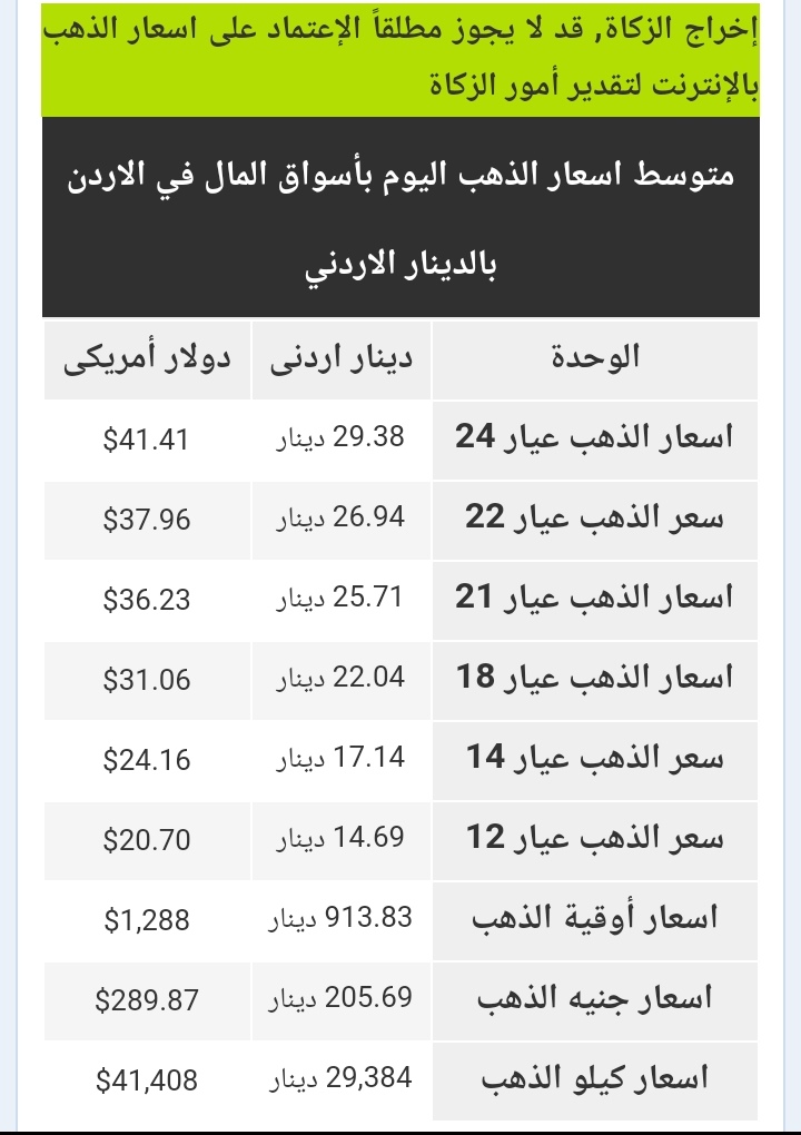 ويتضمن سعر الذهب عيار 24، 22، 21، 18، 14، 12، ويشمل أيضاً سعر كيلو الذهب وسعر الأوقية - الأونصة - وجنيه الذهب طبقا للأسعار في الأسواق الأردنية.