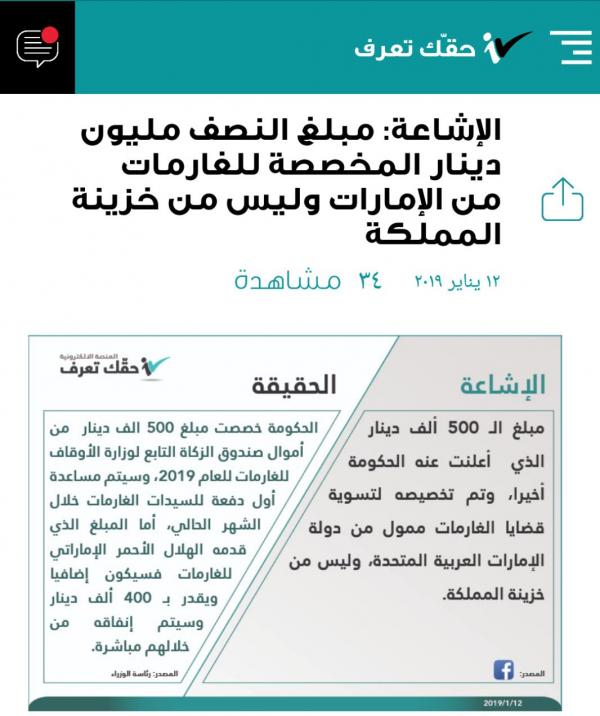أحداث اليوم - نفت الحكومة اليوم السبت عبر منصة حقك تعرف ما يشاع حول الـ 500 الف دينار المخصصة للغارمات انها من دولة الامارات، مؤكدة انها من خزينة الدولة.