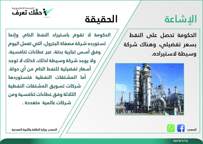 وجاء الرد الحكومي إثر اشاعة تقول إن "الحكومة تحصل على النفط بسعر تفضيلي، وهناك شركة وسيطة لإستيراده".