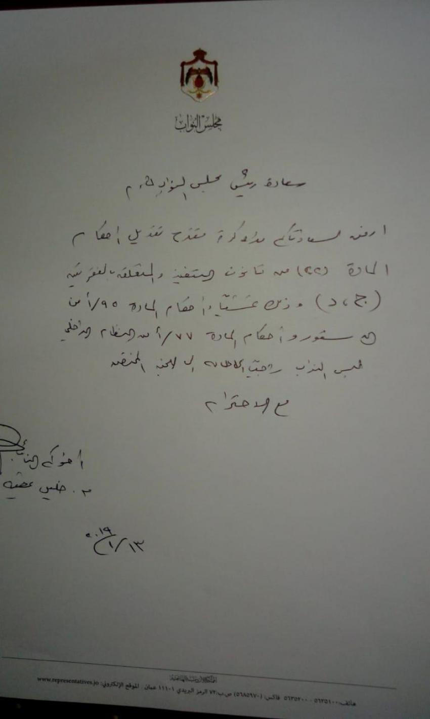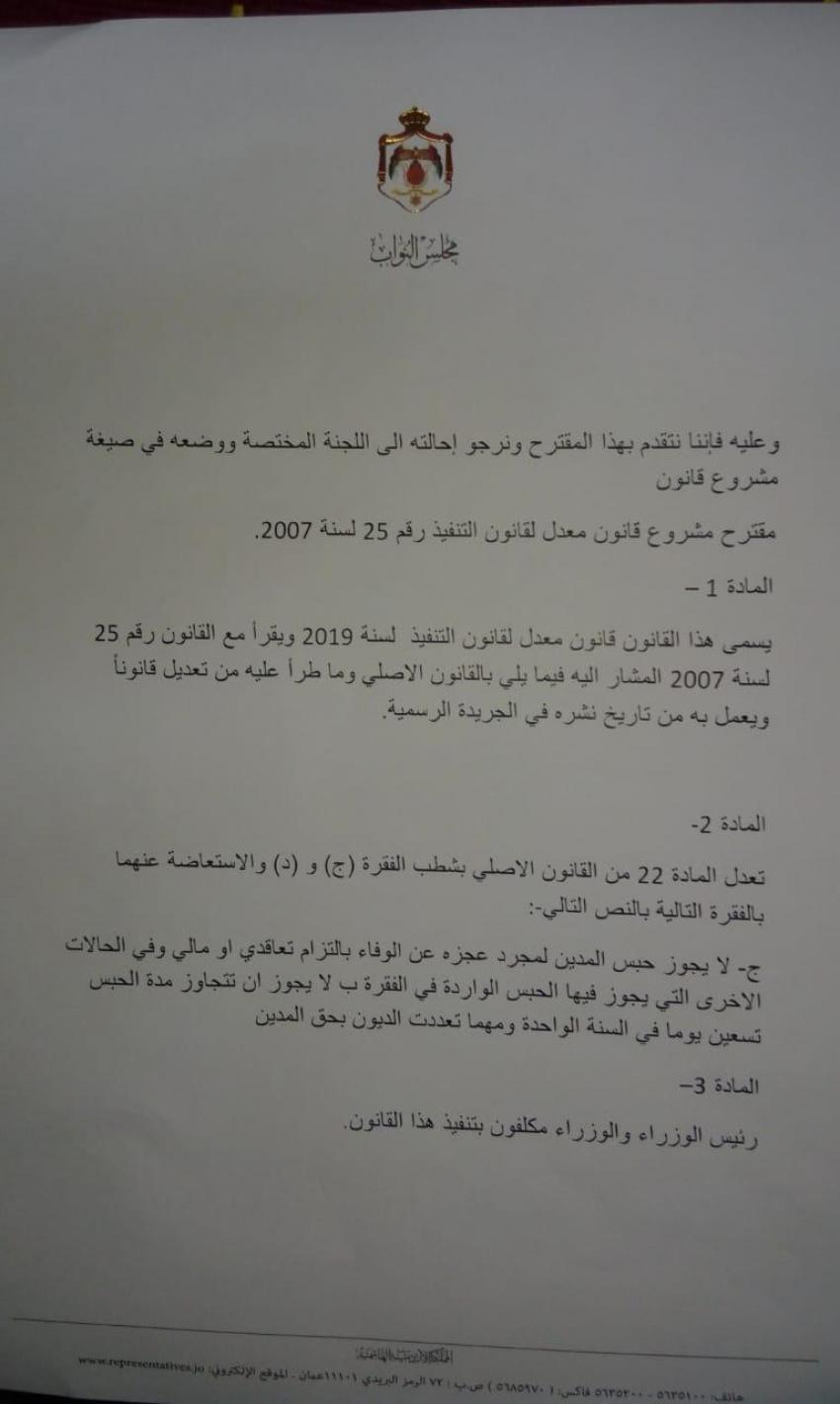 نحن النواب الموقعين أدناه واستناداً لاحكام المادة 95/1 من الدستور الاردني والمادة 77/أ من النظام الداخلي لمجلس النواب وحيث أنه يجوز لعشرة نواب أو اكثر ان يقترحوا القوانين نرجو ان نضع امام سعادتكم مقترحاً بمشروع قانون لتعديل قانون التنفيذ بحيث لا يجوز حبس المدين لمجرد عجزه عن سداد التزاماته المالية، كما وان العديد من المحكومين في الدعاوى التنفيذية حاليا يعانون بسبب وجودهم بالحبس مدة طويلة وعلى أكثر من دين واحد حيث يستمر بقاءهم لتنفيذ قرارات حبسهم من دون ان يستفيد اي طرف وهذا اضر بهم وبعائلاتهم بالنظر لوجود المادة 22 / ج من قانون التنفيذ الحالي والتي تنص (لا يجوز ان تتجاوز مدة الحبس تسعين يوما في السنة الواحدة عن دين واحد ولا يحول ذلك دون طلب الحبس مرة اخرى بعد انقضاء السنة) وذلك للأسباب التالية :-