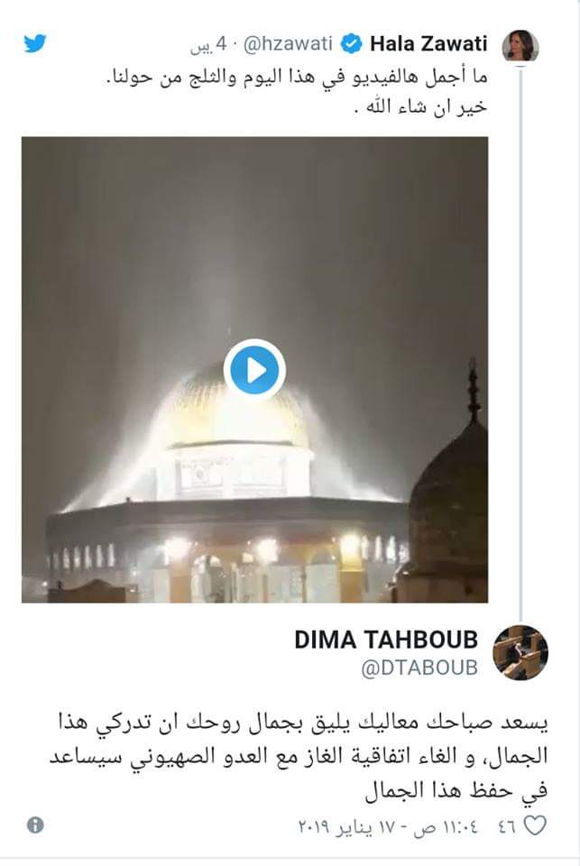 أحداث اليوم - رصد - نشرت وزيرة الطاقة هالة زواتي مقطع فيديو عبر حسابها الشخصي في موقع التدوينات القصيرة "تويتر" تظهر فيه قبة الصخرة تحت الثلوج والأمطار.