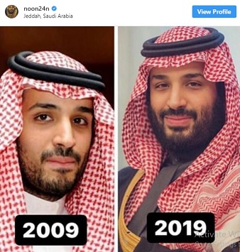 ونشرت الحربي، عبر حسابها على "أنستجرام"، صورة جمعت فيها صورتين للأمير محمد بن سلمان من عامين 2009 و 2019 وعلقت عليها بهاشتاغ "سمو سيدي ولي العهد الأمير محمد بن سلمان بن قدوتنا".