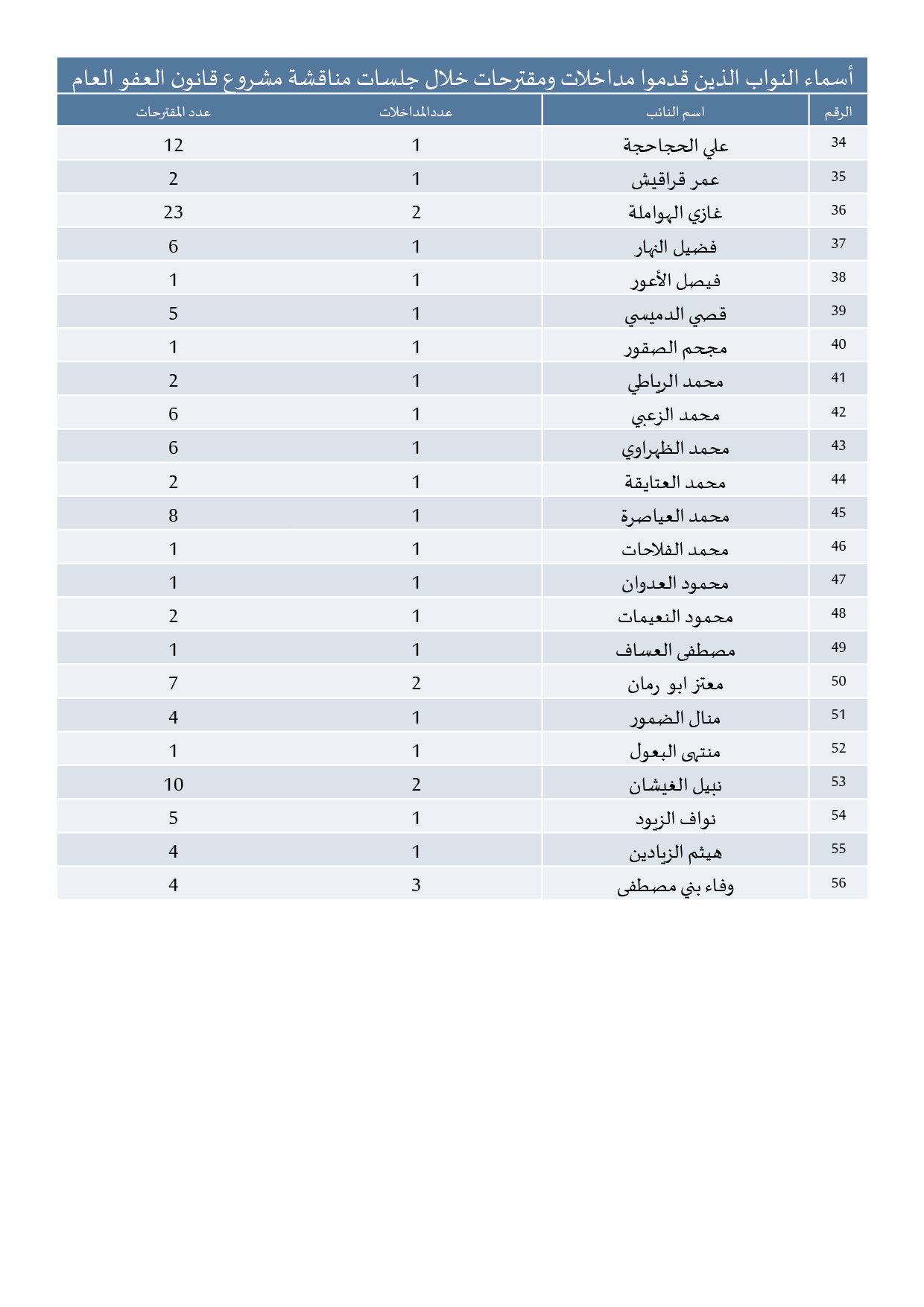 وفيما يتعلق بمداخلات النواب خلال جلستي مناقشات مشروع قانون العفو العام يتبين أن عدد المداخلات التي قدمها النواب وصلت إلى 71 مداخلة تم تقديمها من خلال 56 نائباً، وتضمنت المداخلات 267 مقترحاً، ومن الجدير ذكره أن مقترحاً واحداً فقط توافق أعضاء المجلس عليه ونجح من خلال التصويت قدمه النائب عبدالكريم الدغمي والمرتبط بموضوع الشيكات.