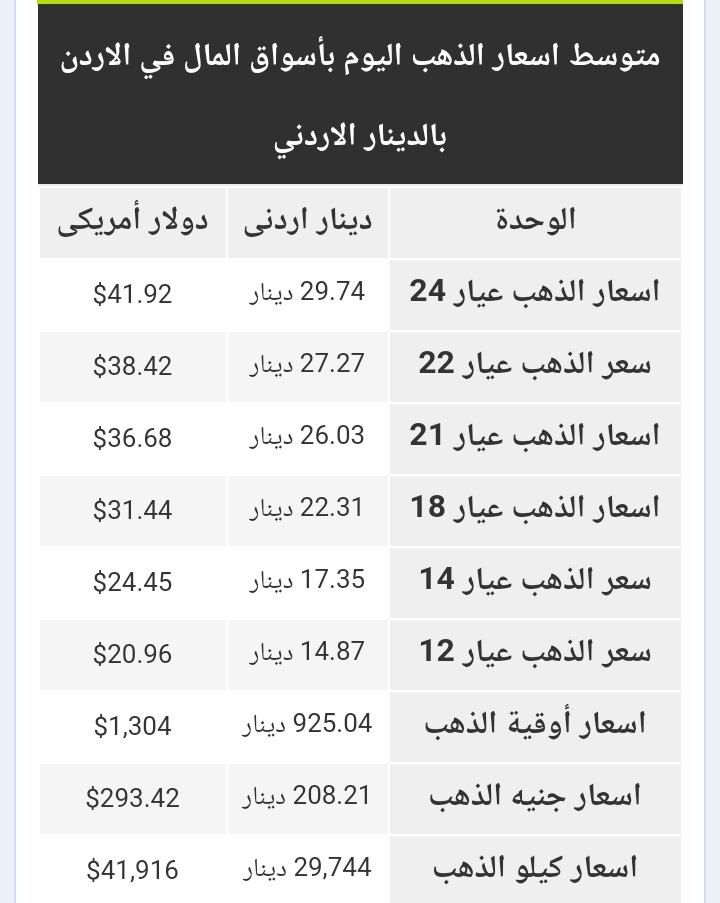 ويتضمن أسعار الذهب من عيار 24,22,21,14,12 بالإضافة إلى سعر الكيلو والأوقية "الأونصة" وجنيه الذهب طبقا للأسعار الأردنية.