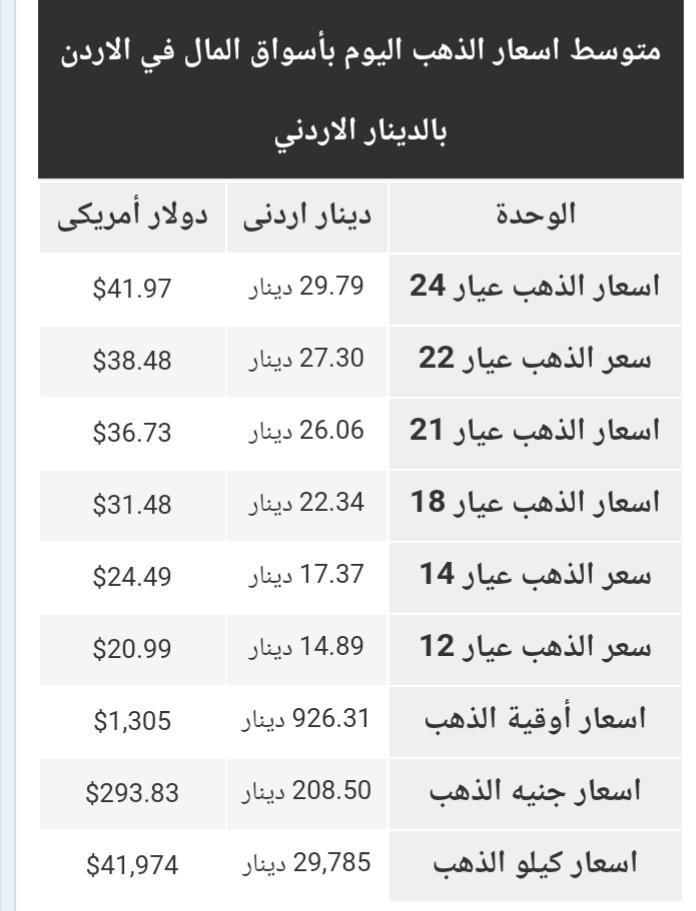 يتضمن أسعار الذهب من عيار 24,22,21,14,12 بالإضافة إلى سعر الكيلو والأوقية "الأونصة" وجنيه الذهب طبقا للأسعار الأردنية.